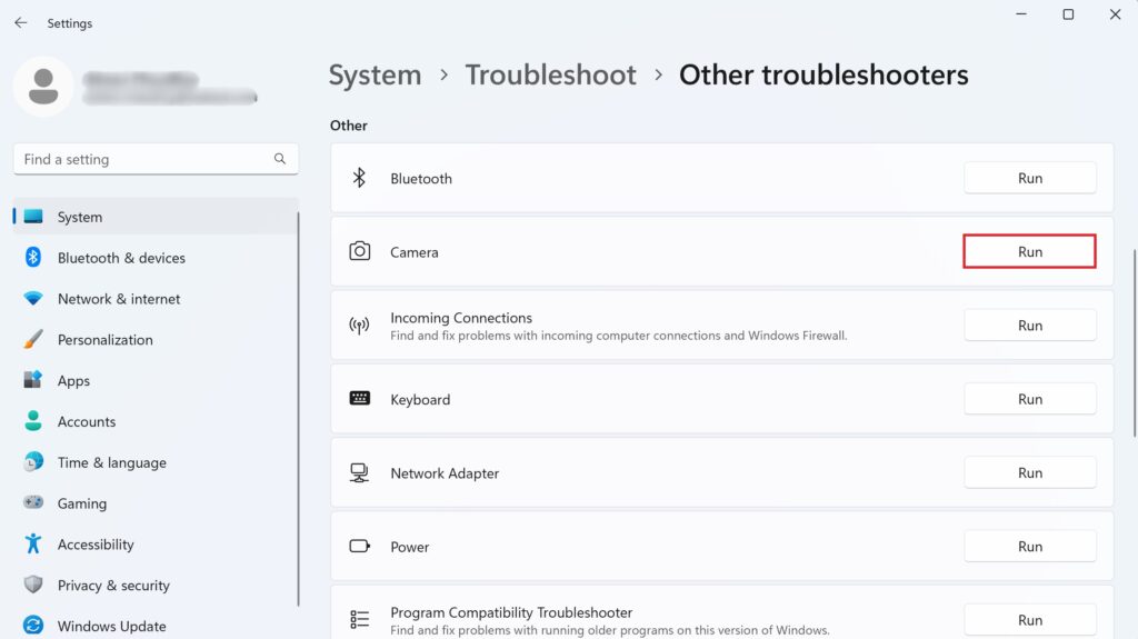 Vá para o menu Iniciar da barra de tarefas. Em seguida, clique no ícone de engrenagem para abrir Configurações. No painel esquerdo, vá para a guia Sistema . Agora, selecione Solucionar problemas no painel direito. Em seguida, clique em Outras soluções de problemas. Role para baixo e procure por Câmera. Em seguida, clique em Executar ao lado dele. Siga as instruções na tela para executar a solução de problemas da câmera.