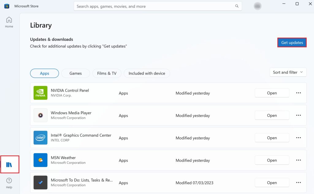 Vá para o ícone Pesquisar na barra de tarefas. Pesquise por Microsoft Store e clique em Abrir no painel direito. Agora, vá para a guia Biblioteca no painel esquerdo. Em seguida, clique em Obter atualizações. Se houver alguma atualização disponível para o aplicativo Câmera, clique em Baixar e instalar.