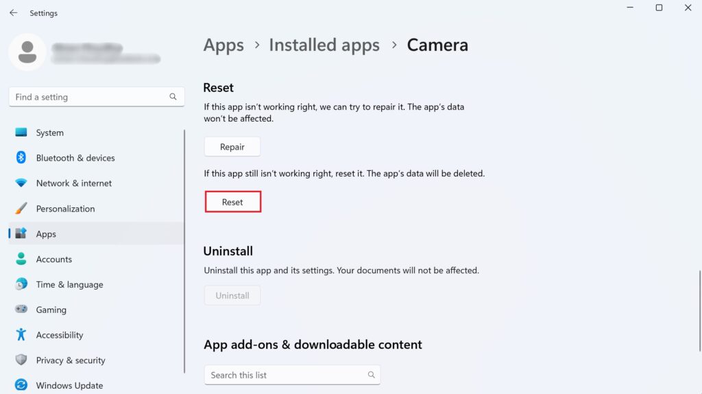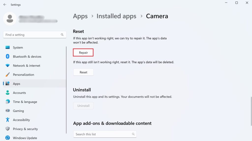 Primeiro, clique com o botão direito do mouse no Menu Iniciar na barra de tarefas. Na lista de opções, selecione Aplicativos instalados. Agora, role para baixo e procure por Câmera. Em seguida, clique no ícone de três pontos no lado direito. Em seguida, clique em Opções avançadas. Depois disso, role para baixo e procure a opção Reparar e clique nela. Isso reparará o aplicativo da câmera. Se o erro persistir, tente redefinir o aplicativo clicando no botão Redefinir .