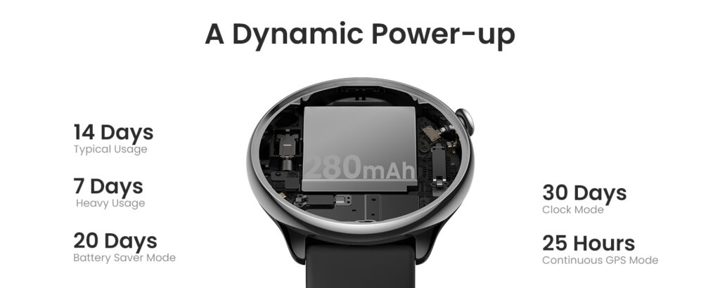 No lado da bateria, temos uma bateria de 280mAh que será últimos 14 dias em uso normal. Possui um modo de economia de bateria que o estende para 20 dias, enquanto o modo de relógio leva para 30 dias. Por outro lado, o uso intenso restringirá a vida útil da bateria para 7 dias, enquanto se você usar o GPS continuamente, a bateria durará 25 horas de acordo com o Amazfit.