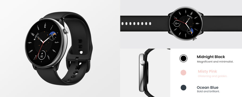 Amazfit GTR Mini está disponível na Índia com um chassi de 42 mm. Ele pesa apenas 24,6 gramas e a espessura é de apenas 9,25 mm. Para efeito de comparação, o GTR 4 pesa 34 gramas e tem espessura de 12,4 mm. No aspecto do design, temos um mostrador circular feito de aço inoxidável com tiras de silicone de 20 mm que não agridem a pele e que o usam no pulso. Parece muito mais premium do que alguns dos rivais neste segmento de preço.