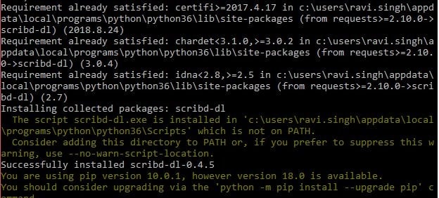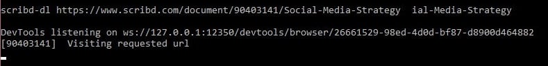 Isso fará o download do módulo necessário para seu ambiente Python. Agora digite scribd-dl + URL do documento. Por exemplo – https://www.scribd.com/document/90403141/Social-Media-Strategy