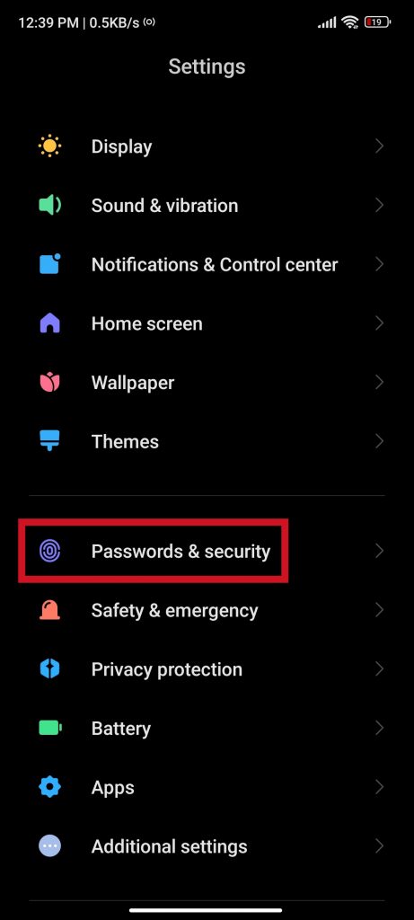 Em seguida, uma vez dentro das Configurações, vá para a seção “Senhas e segurança”.