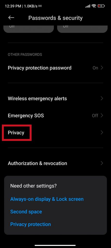 Depois disso, pressione “Privacidade”, é importante que você entre nesta seção se quiser acertar a alteração do PIN do SIM.