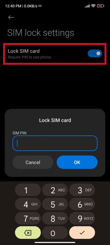 Em seguida, habilite a opção “Bloquear cartão SIM”. Digite o número completo, são quatro dígitos e clique em “OK” para confirmar.
