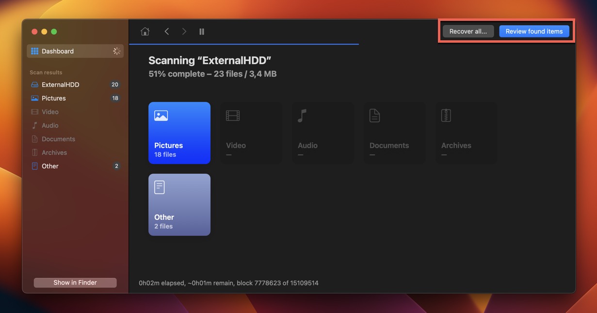 Revise os itens encontrados durante a verificação clicando no botão Revisar itens encontrados ou aguarde o Disk Drill concluir a verificação e clique no botão botão.