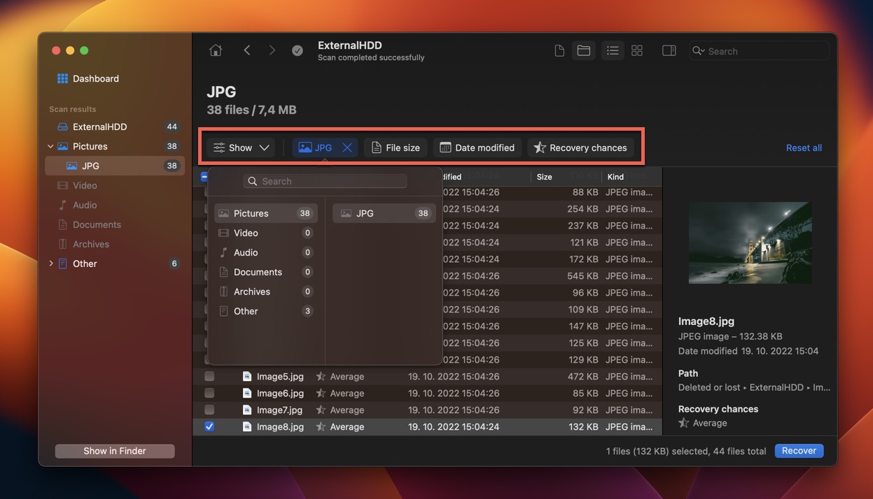 Percorra Arquivos existentes (se disponíveis), Reconstruídos e Excluídos ou perdidos e selecione todos os arquivos que deseja recuperar. Você pode usar os filtros do Disk Drill para restringir os resultados da verificação. Lembre-se de visualizar os arquivos para verificar sua capacidade de recuperação.