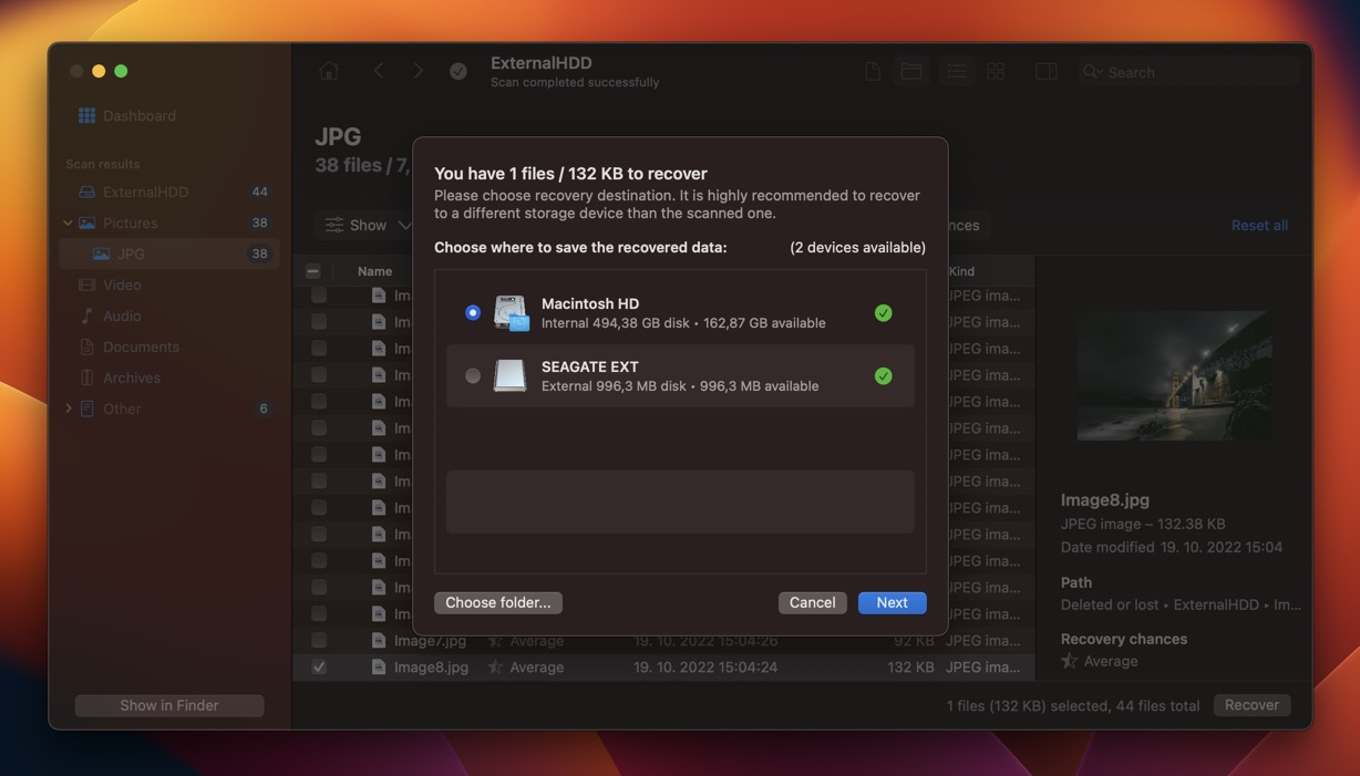 Clique no botão Recuperar e diga ao Disk Drill onde você deseja que os arquivos selecionados sejam recuperados (evite selecionar seu disco rígido externo Seagate). Por fim, clique em Avançar para prosseguir.