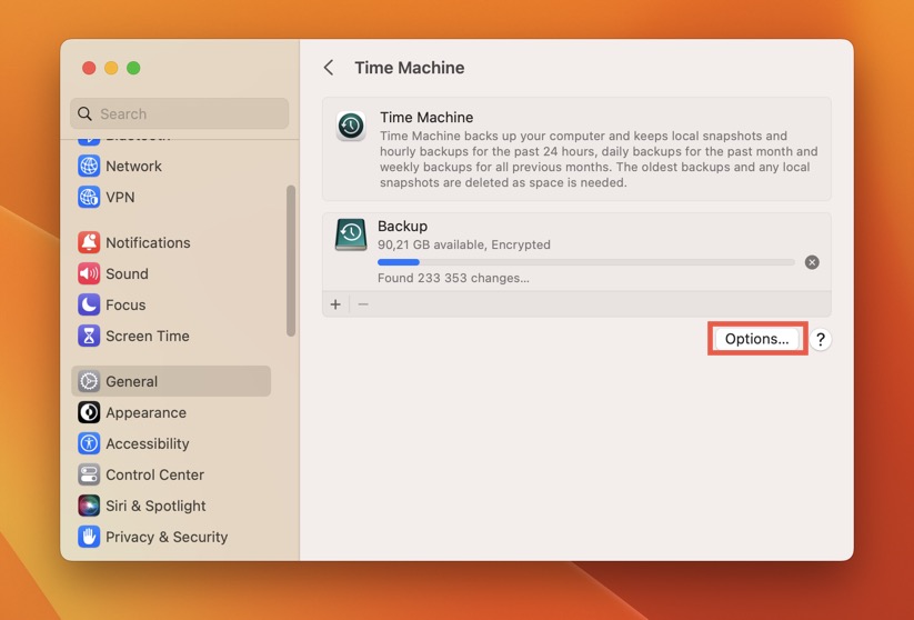 Inicia as configurações do sistema. Vá para Geral > Máquina do Tempo. Verifique se o Time Machine está ativado. Se estiver, clique no botão Opções.