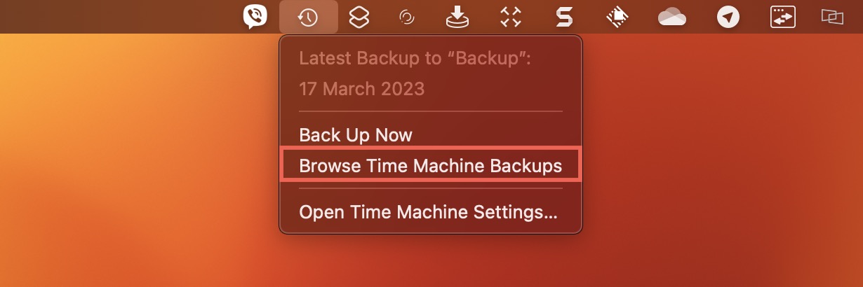 Clique no ícone do Time Machine na barra de menus. Selecione a opção Procurar backups do Time Machine.