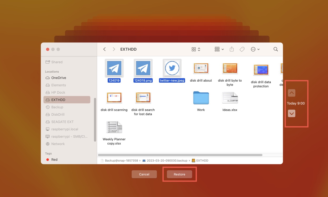 Navegue até o disco rígido externo da Seagate. Use as setas à direita para voltar a uma data e hora antes do evento de perda de dados. Selecione os arquivos perdidos que deseja recuperar e clique no botão Restaurar.
