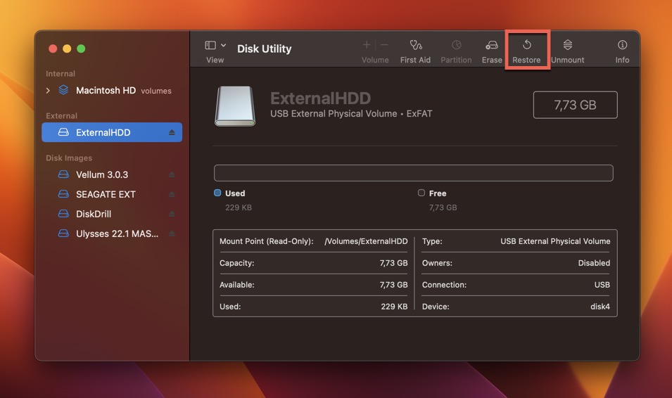 Inicie o Utilitário de Disco. Você pode encontrá-lo em Aplicativos > Utilitários. Selecione seu disco rígido externo Seagate na lista de dispositivos de armazenamento disponíveis à esquerda. Se você não o vir, verifique se a unidade está conectada ao seu Mac. Clique no botão Restaurar.