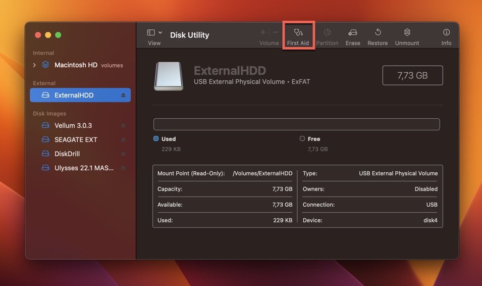Se você não conseguir acessar o conteúdo do seu disco rígido externo Seagate porque o disco rígido está corrompido e impossível de abrir Finder, você pode tentar consertá-lo com o recurso First Aid no Disk Utility.