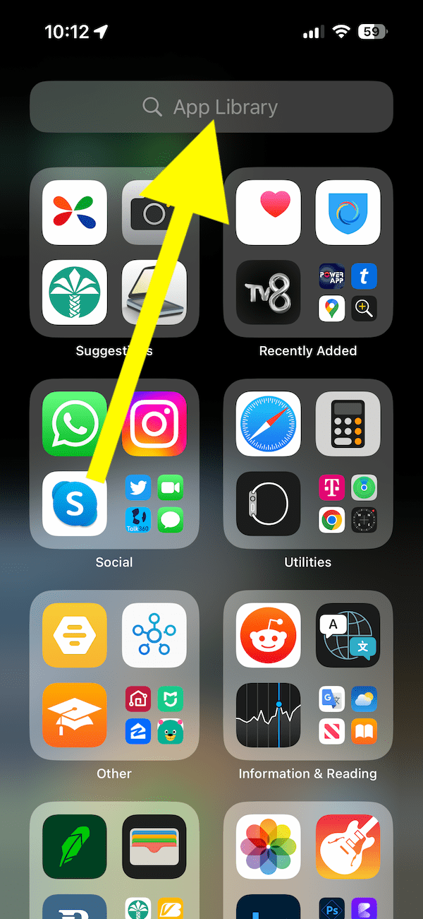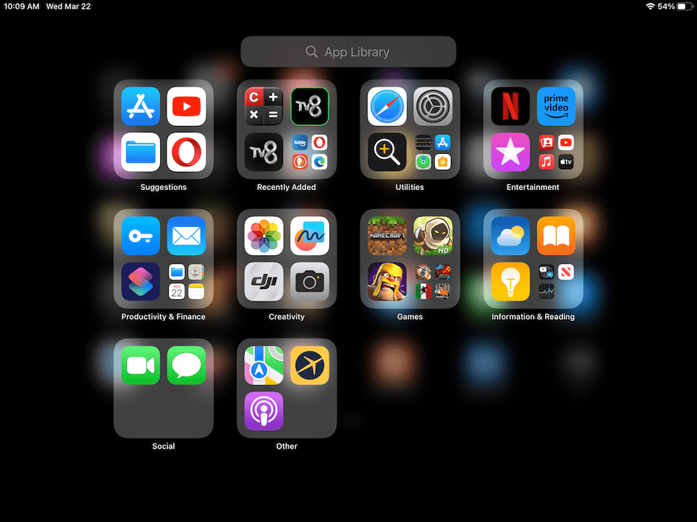 Se você tiver muitos aplicativos, a Biblioteca de aplicativos pode parecer confusa e lotada. Todos os seus aplicativos instalados (independentemente de estarem na tela inicial ou não) no seu iPhone ou iPad estarão na Biblioteca de aplicativos. Todos os aplicativos são organizados em diferentes categorias, como Sugestões, Adicionados recentemente, Utilitários, Social, Outros, etc., como você pode ver abaixo: