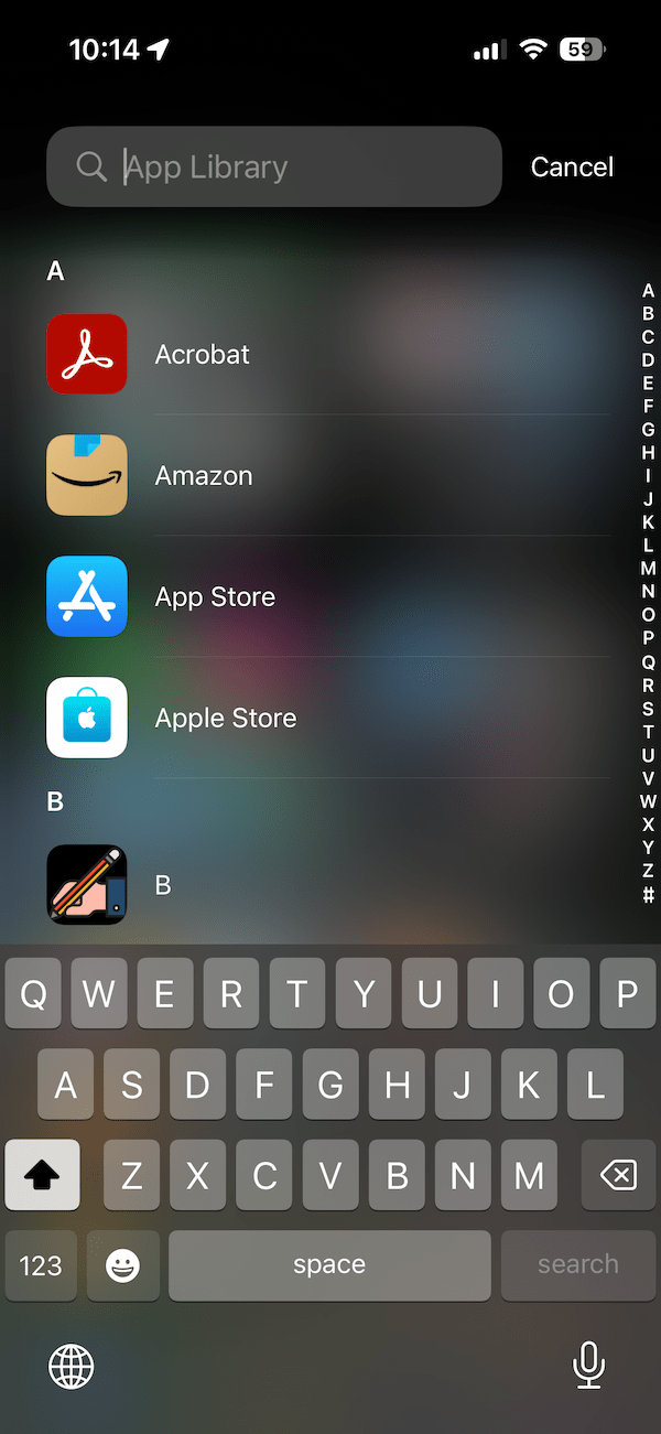 Na App Library, role para cima (deslizando para baixo) e os aplicativos serão listados em ordem alfabética.