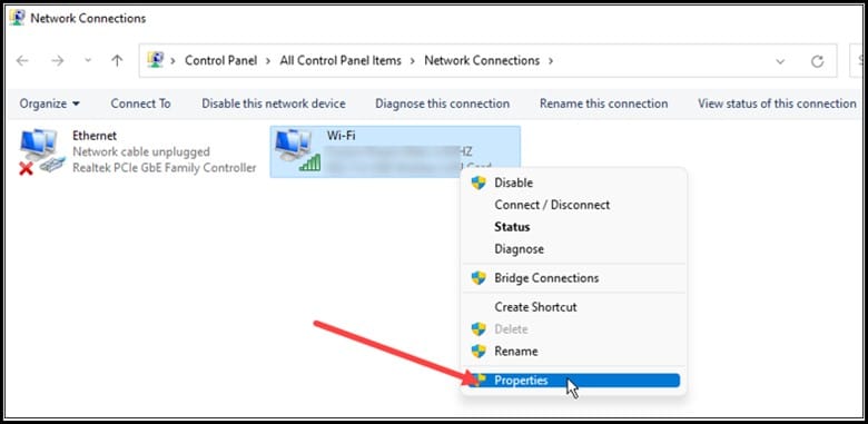 Clique com o botão direito do mouse no Adaptador de rede que você está usando e abra suas Propriedades.