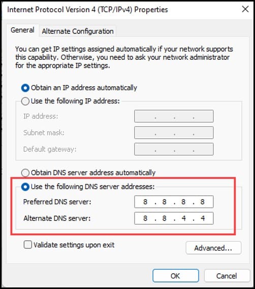 Agora altere o valor do Endereço do servidor DNS preferencial para 8.8.8.8 e o endereço do servidor DNS alternativo para 8.8.4.4. Clique em OK para salvar as alterações.