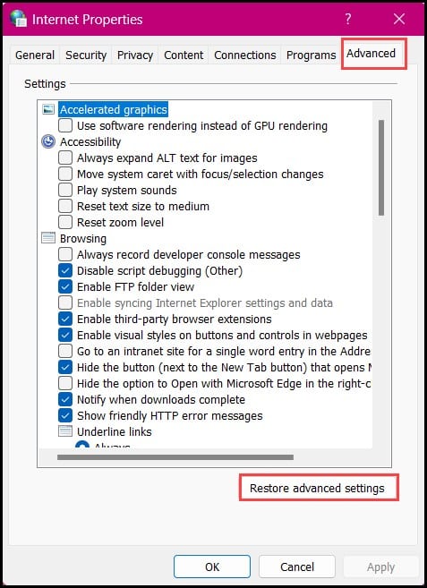 Na próxima janela, clique na guia “Avançado”. Por fim, clique em “Restaurar configurações avançadas” e, em seguida, pressione o botão “OK” para redefinir suas configurações de internet.
