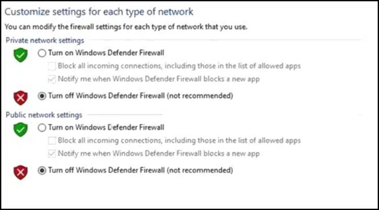 No menu Iniciar do Windows, digite Windows Defender Firewall e abra o resultado superior. Clique na opção Ativar ou desativar o firewall do windows defender. Desative o Windows Defender Firewall nas configurações de rede pública e privada.