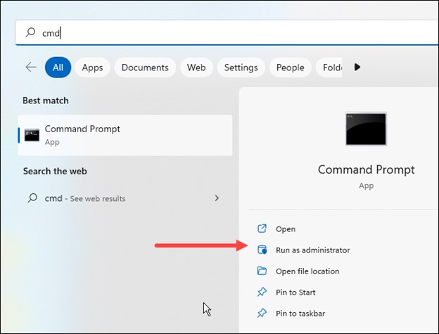 Digite CMD na barra de pesquisa do Windows e clique com o botão direito do mouse no prompt de comando opção. Escolha Executar como administrador.
