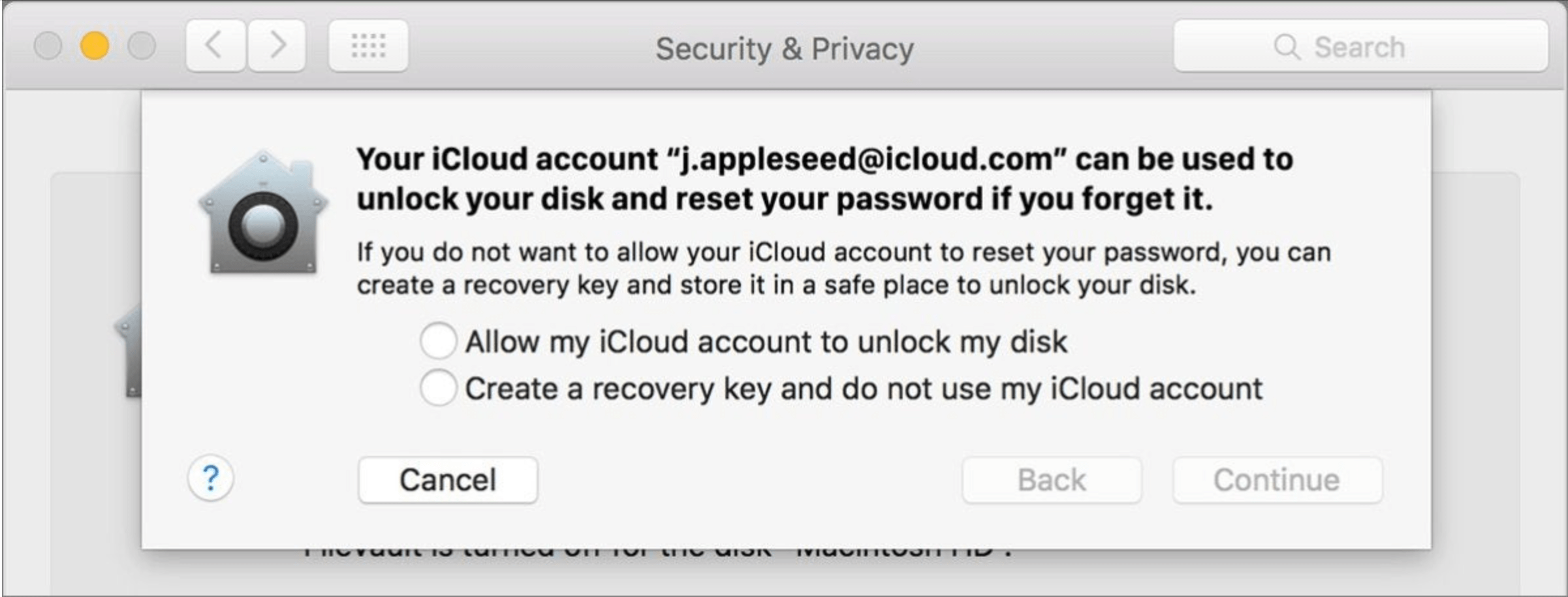 Se você optou por usar o iCloud ao configurar o FileVault, você não tem uma chave de recuperação. Nesse caso, você pode usar sua conta do iCloud para recuperar o acesso aos dados do seu Mac.