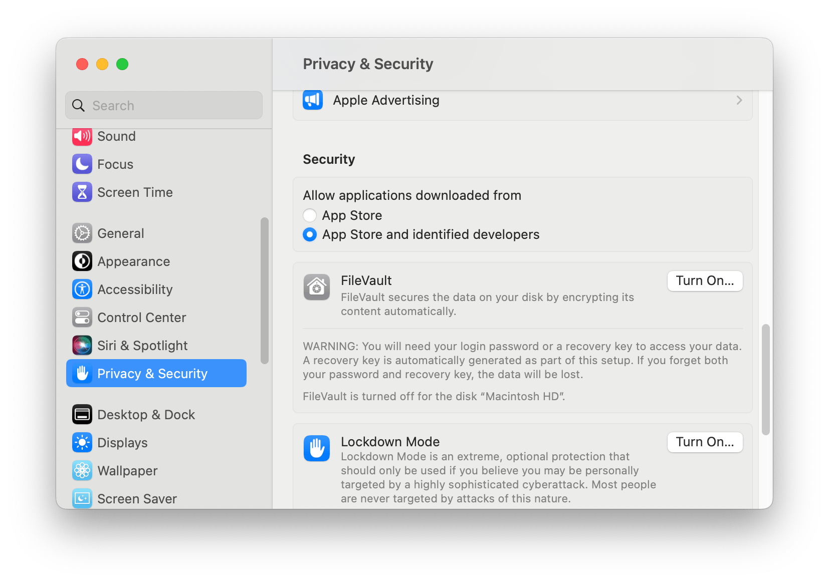 Abra o menu Apple na barra de menu superior e selecione Configurações do sistema. Em Configurações do sistema, clique em Privacidade e segurança na barra lateral esquerda. Role para baixo para encontrar FileVault na seção Segurança. Clique em Ativar. Veja abaixo mais informações sobre a escolha entre usar sua conta do iCloud ou usar uma chave de recuperação caso você esqueça sua senha de usuário. O processo de criptografia pode levar muito tempo e, uma vez iniciado, você não poderá desativá-lo até que seja concluído. Você ainda pode usar seu Mac durante o processo.