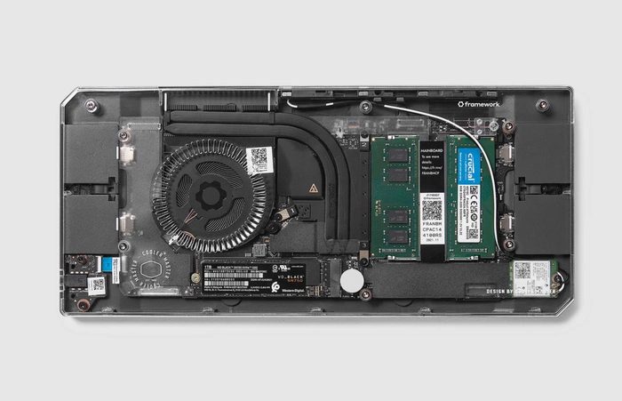 “Cooler Master e Framework se unem para produzir uma tela transparente caso para o Framework Laptop 13 Mainboard. Exiba facilmente o funcionamento interno do seu Framework Laptop 13 sem comprometer a proteção. Como a placa-mãe do Framework Laptop 13 é um módulo autônomo, tudo o que você precisa para um computador ligado é o gabinete da placa-mãe Cooler Master, memória, armazenamento, WiFi ou uma placa de expansão Ethernet, adaptador de alimentação USB-C e um monitor.”