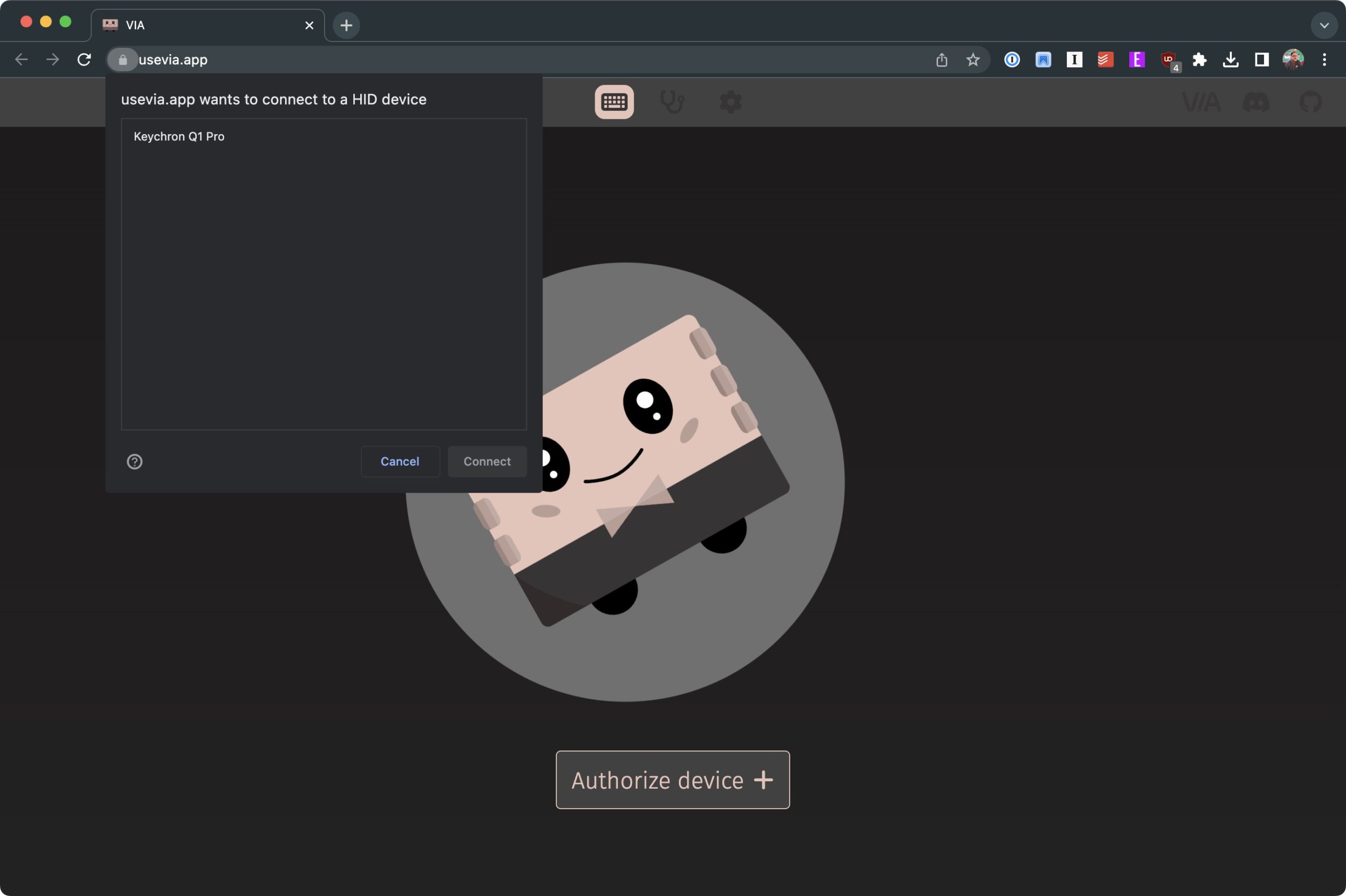 Conecte seu teclado compatível com VIA a um dispositivo Mac ou Windows. Abra o navegador de sua preferência, de preferência Google Chrome ou Microsoft Edge. Navegue até usevia.app. Clique no botão Autorizar dispositivo+ . Quando solicitado, localize e selecione seu teclado na lista de dispositivos conectados. Clique no botão Conectar no canto inferior direito da janela.