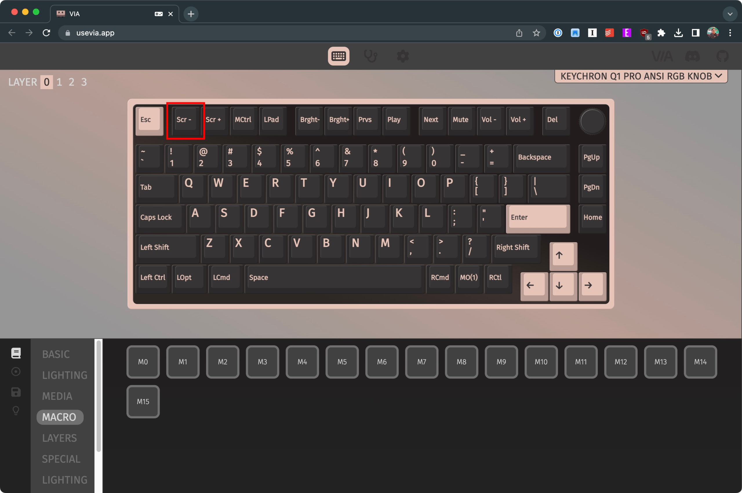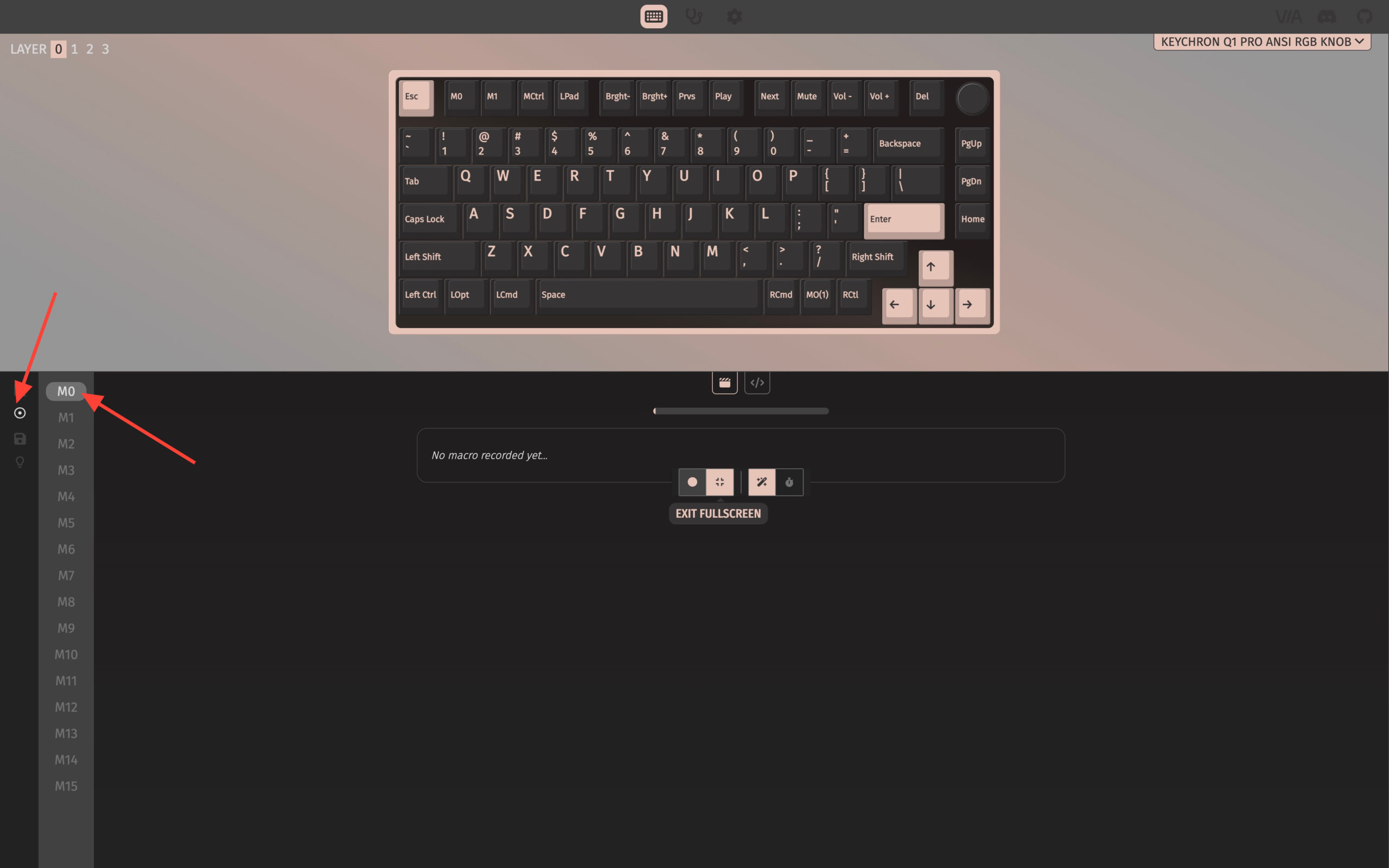 Na seção inferior à esquerda, clique em MACRO. Na visualização do teclado na metade superior da janela, selecione qual tecla você definirá como Macro.
