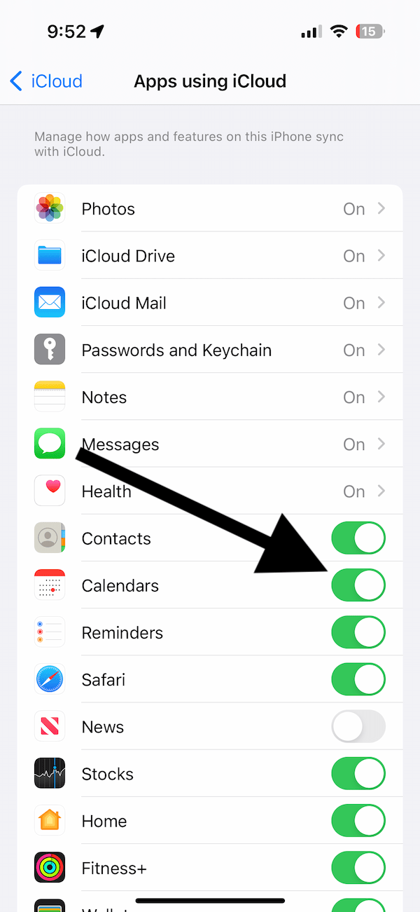 De acordo com nossas experiências, sabemos que às vezes uma falha do iCloud pode causar esse problema. Você pode estar experimentando isso. Esta é uma solução fácil. As etapas abaixo descrevem como desativar e ativar o iCloud para Calendários. Você não perderá nenhum dado. Veja como: