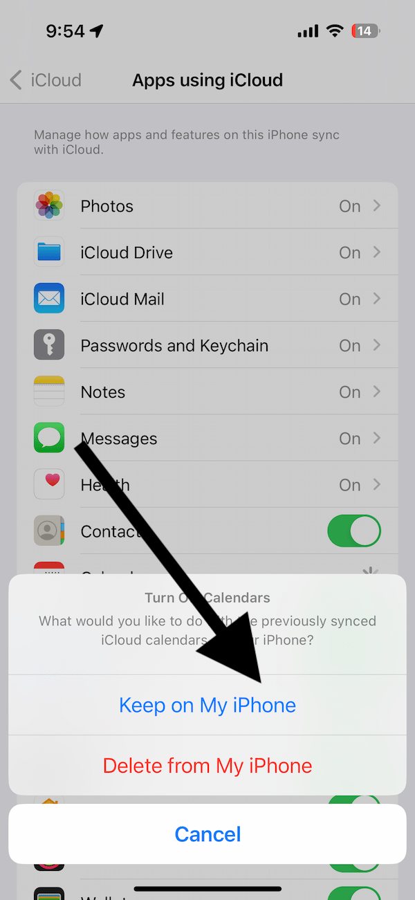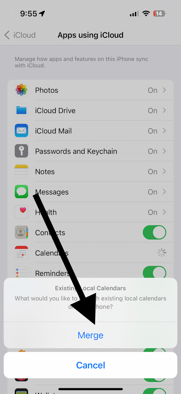 Selecione Manter opção. Não selecione a opção Excluir (claro, a menos que você queira excluir). A opção Manter salvará os dados no seu iPhone ou iPad. Aguarde a conclusão do processo. Pode levar até um minuto. Em seguida, ligue o interruptor novamente. Como escolhemos a opção Manter, você será perguntado o que deseja fazer com os dados salvos do iCloud. Um pop-up dizendo “Calendários locais existentes” perguntará se você deseja Mesclar. Selecione Mesclar para evitar a perda de dados do Calendário.