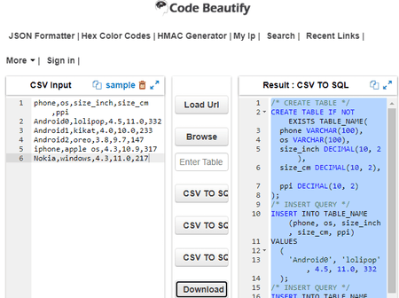 Como converter CSV para SQL online usando codebeautify.org:
