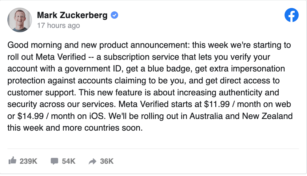 Ontem à noite, Mark Zuckerberg, o fundador do Meta(Facebook), anunciou que eles, assim como o Twitter, começarão a vender símbolos de verificação para seus usuários na Austrália e na Nova Zelândia.