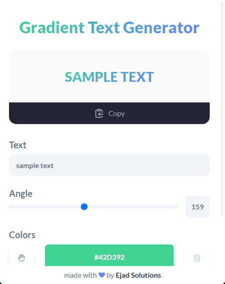 Inicie este site usando o link fornecido. Depois disso, insira um texto personalizado no campo Texto sobre o qual deseja aplicar o gradiente de texto. Agora, selecione as cores do gradiente de texto e selecione o ângulo do gradiente. Por fim, visualize a aparência do texto e copie o código CSS usando a opção Copiar.