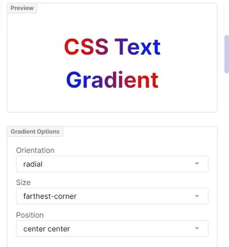 Visite este site usando o link fornecido. Depois disso, use a faixa de cores para selecionar uma ou mais cores para o gradiente de texto. Em seguida, especifique o tipo de gradiente e a posição do gradiente. Agora, visualize o texto de amostra com gradiente adicionado especificado pelos usuários. No final, clique no botão Copiar para copiar o código do gradiente de texto CSS.
