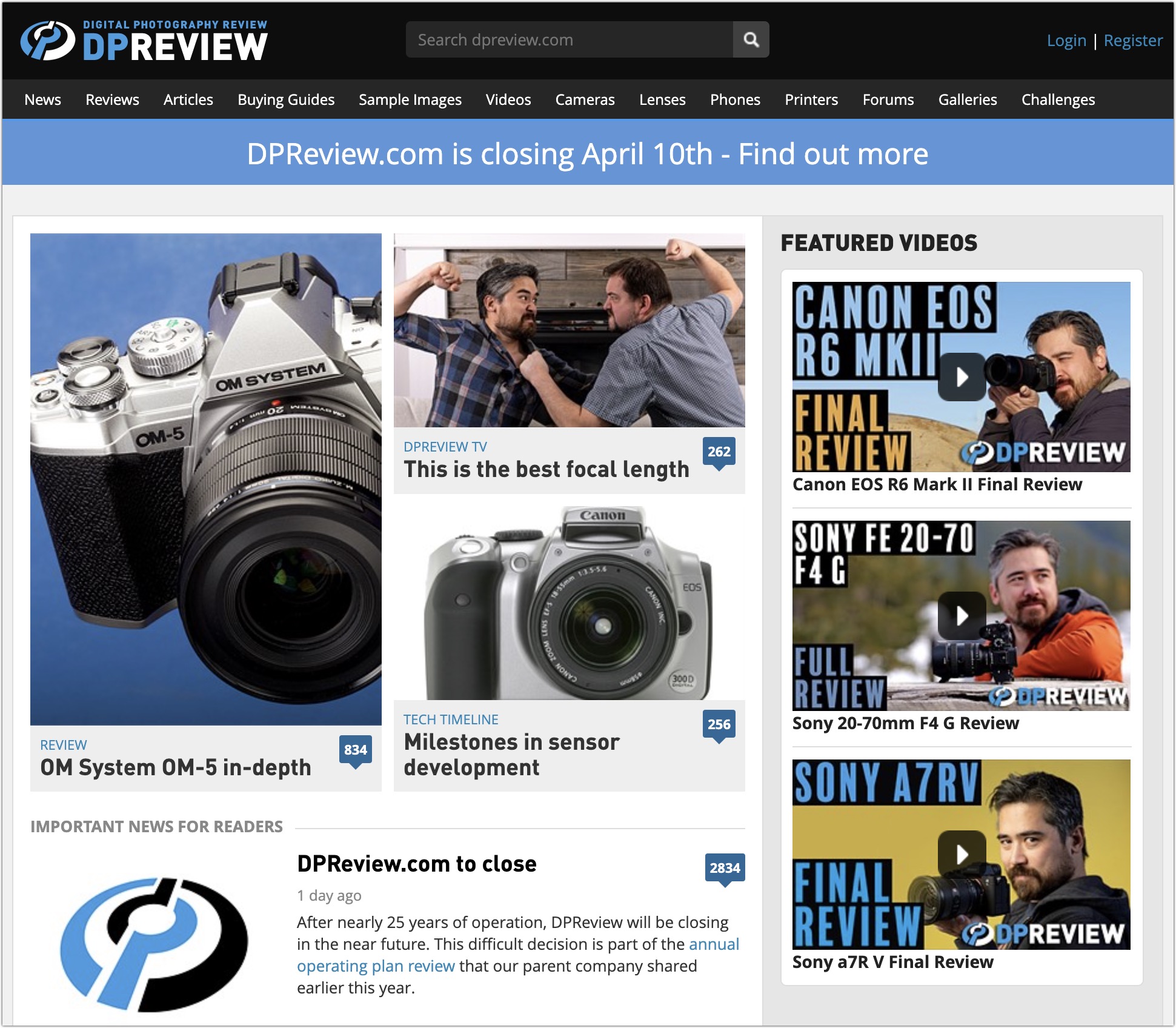 El venerable sitio de fotografía (DP significa fotografía digital) anunció que cerrará el 10 de abril de 2023, momento en el que su el contenido estará”disponible en modo de solo lectura durante un período limitado después”. Ese contenido incluye revisiones detalladas de cuerpos y lentes de cámaras, además de artículos que cubren todos los aspectos del campo de la fotografía. Es un recurso inigualable de información fotográfica.