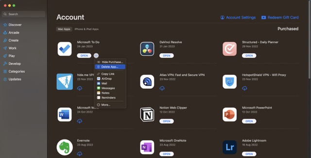 Las aplicaciones que haya descargado de App Store, tanto las actuales como las anteriores, se aparecer. Para las aplicaciones que todavía tienes en tu Mac, selecciona el icono circular con tres puntos junto al logotipo.