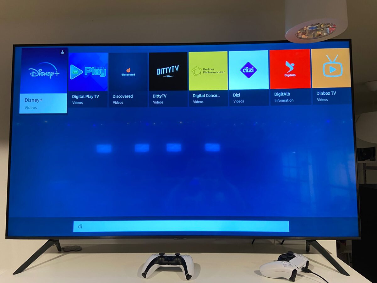 En la barra de búsqueda, escribe Disney Plus. Tenga en cuenta que si no puede encontrar la aplicación con este nombre, intente escribir Disney+. Vale la pena mencionar que puede hacer esto usando un control remoto o también puede usar los botones físicos ubicados debajo del logotipo central de Samsung.