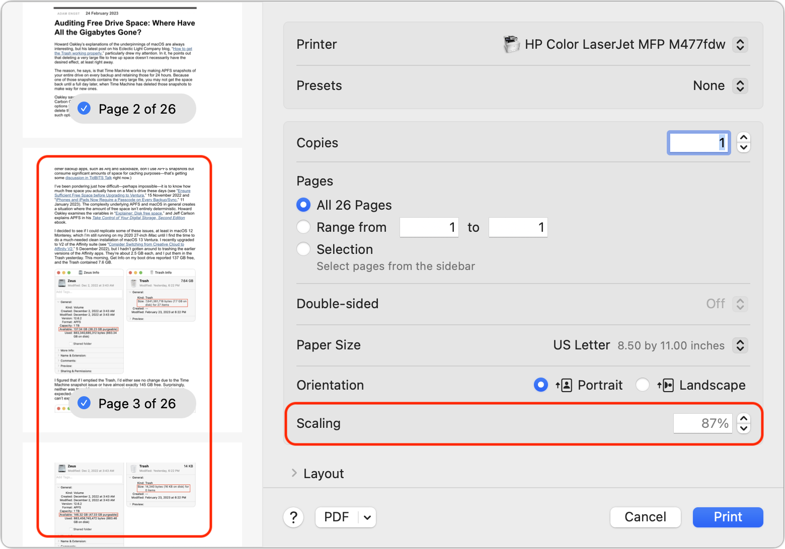 Durante estas conversaciones, Lauri encontró una solución alternativa que tiene sentido en el contexto de la explicación de Neil.. Ella postuló que tal vez las imágenes eran demasiado grandes para cargarlas, por lo que intentó reducirlas con la opción Escalar en el cuadro de diálogo Imprimir, lo que provocó que se mostraran al menos algunas imágenes. Hice pruebas y descubrí que si cambiaba el porcentaje de escala al 99%, algunas imágenes se cargarían, pero estarían borrosas, y otras permanecerían en blanco. Sin embargo, si cambiaba el porcentaje de escala más seriamente, como al 87 %, y luego me desplazaba por la vista previa del documento completo, todas las imágenes aparecerían nítidas en el PDF resultante, incluso si luego devolvía la escala al 100 %. Presuntamente, pedirle al cuadro de diálogo Imprimir que escalara la salida obligó a WebKit a cargar todas las imágenes, permitiéndoles aparecer.