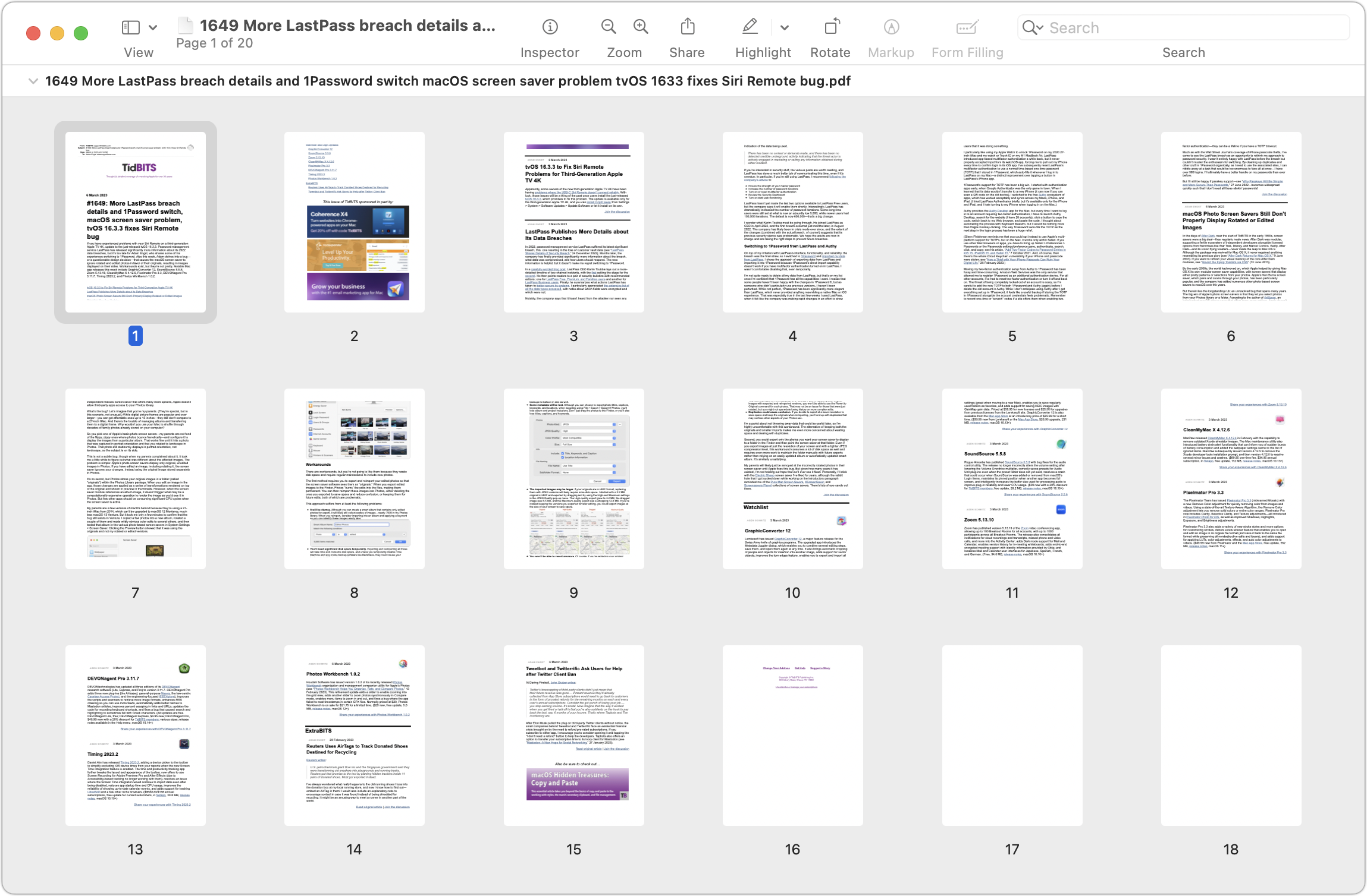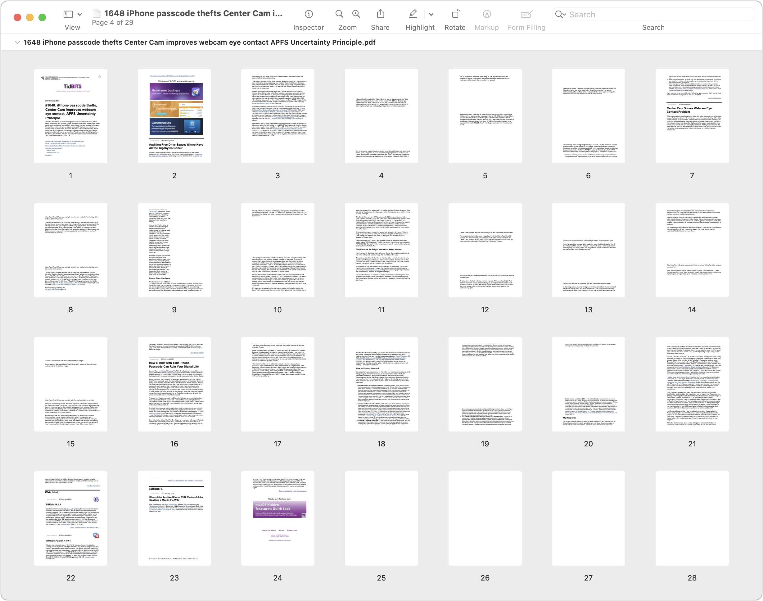 Por lo tanto, aunque no recomiendo imprimir ediciones”TNGD”, no las formateamos para imprimirlas y Consumirá bastante papel, al menos verá las imágenes ahora. Curiosamente, las dos capturas de pantalla anteriores tienen páginas en blanco adicionales al final. No sé por qué Mail los agrega, pero recomiendo eliminarlos. Elija Archivo > Exportar a PDF, abra el archivo en Vista previa, seleccione las páginas en blanco (y cualquier otra página innecesaria) en la barra lateral y elimínelas antes de imprimir.
