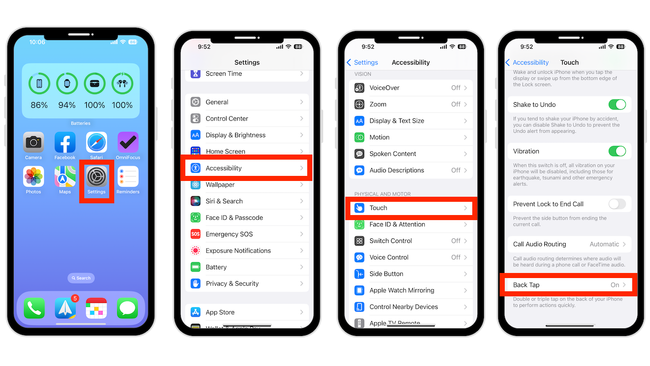 Back Tap es una característica de accesibilidad que es útil para todos. Back Tap le permite tocar dos o tres veces en la parte posterior de su iPhone para activar una acción. Algunos ejemplos son tocar dos veces para abrir la linterna y tocar tres veces para abrir la Lupa. Incluso puede iniciar un atajo personalizado.
