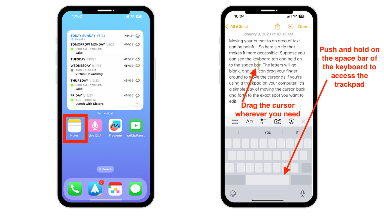 Mover el cursor a un área de texto puede resultar doloroso. Así que aquí hay un consejo que lo hace más accesible. Abra una nueva nota en la aplicación Notas. Agrega algo de texto. Toca y mantén presionada la barra espaciadora. Las letras quedarán en blanco y puedes arrastrar el dedo para mover el cursor como si estuvieras usando un trackpad en tu computadora. Es una forma sencilla de mover el cursor hacia adelante y hacia atrás hasta el lugar exacto que desea editar.