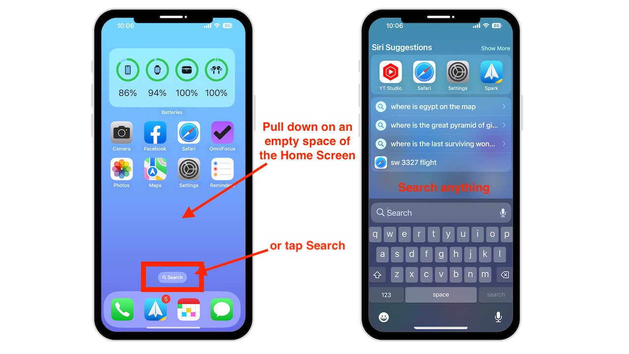 La función de búsqueda global del iPhone es muy potente. Spotlight Search puede encontrar aplicaciones, fotos, documentos, correos electrónicos, mensajes, buscar en la web y mucho más. Para usar Spotlight Search en su iPhone, tiene dos opciones: