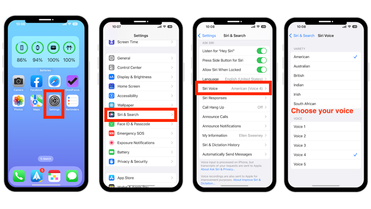 Abra Configuración Toque Siri y busque Seleccione Siri Voice y escuche las opciones