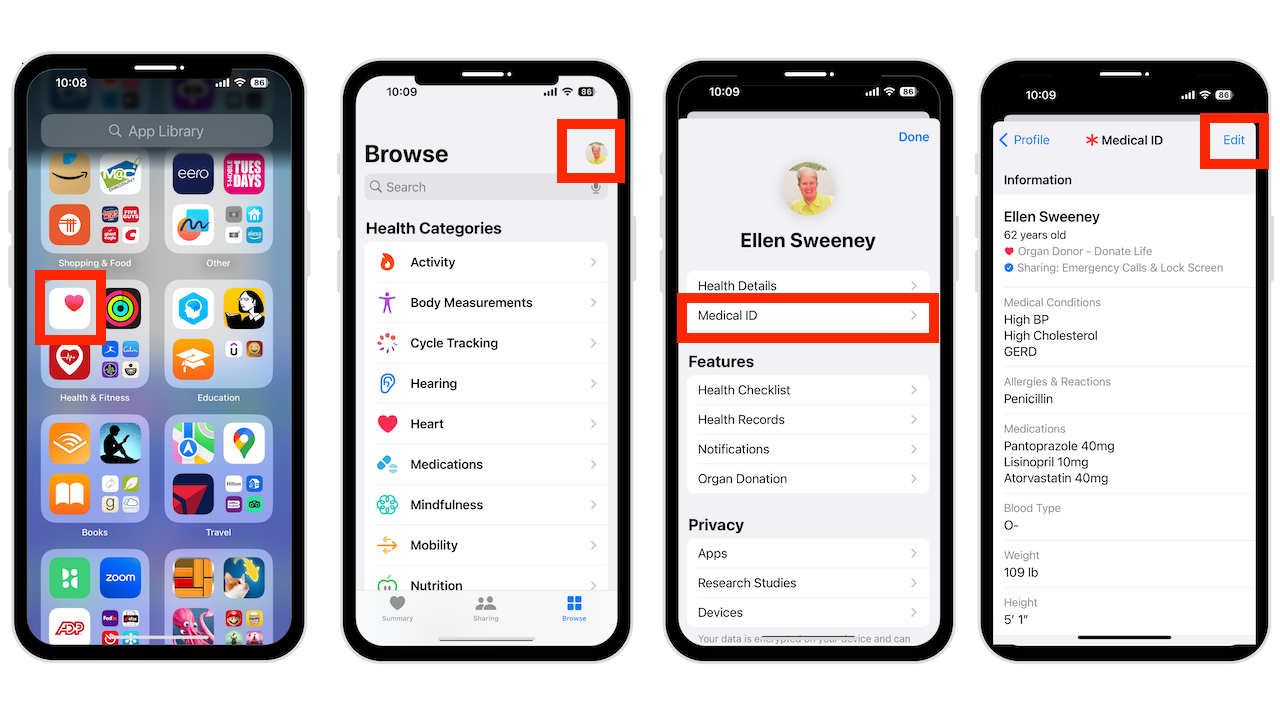 Abra la aplicación Salud. Toque la imagen de su perfil en la esquina superior derecha Seleccione ID médica Toque editar en la esquina superior derecha e ingrese su información médica esencial junto con Contactos, alergias médicas y otra información.