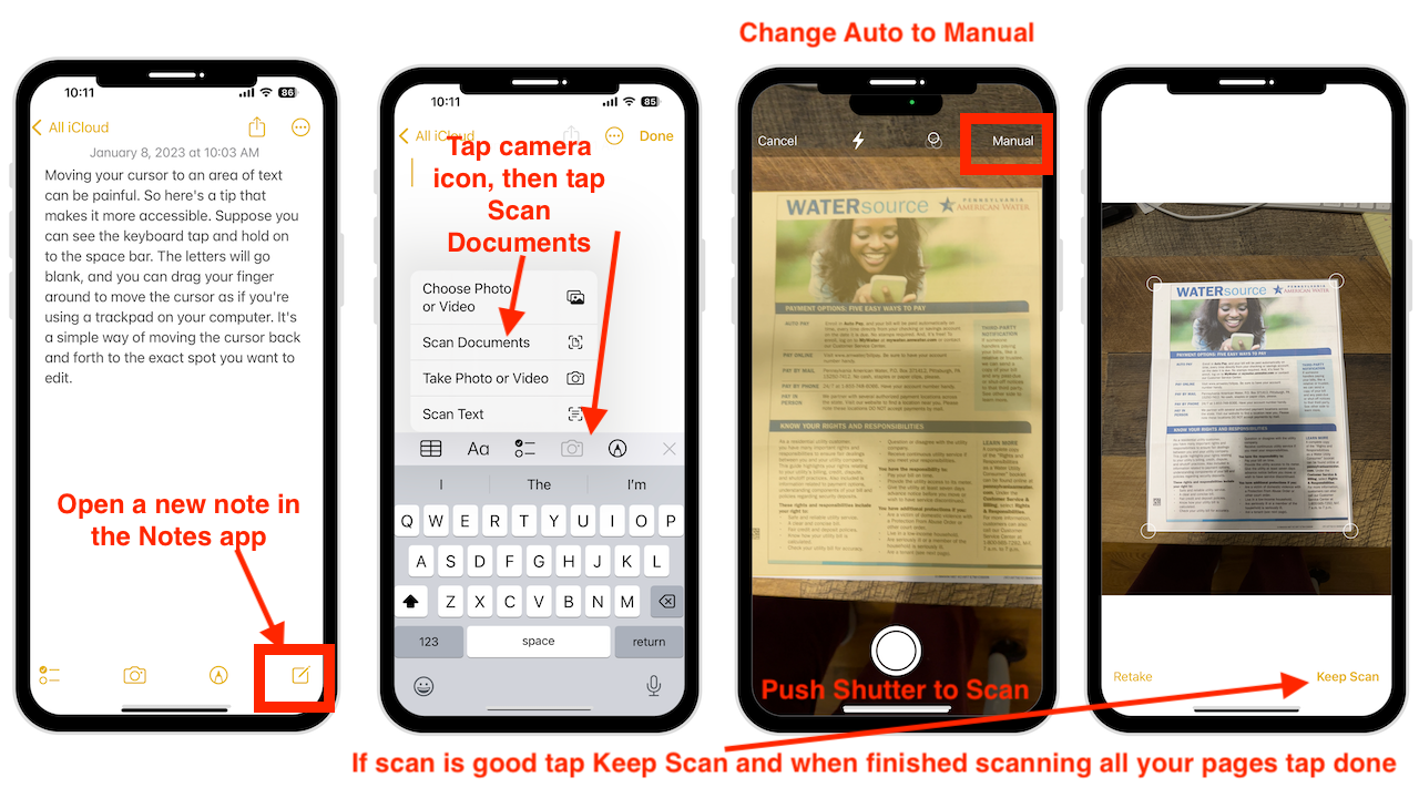 Abra la aplicación Notas. Seleccione el icono Nueva nota. Toque el botón Cámara y luego toque Escanear documentos. En la esquina superior derecha, cambie Auto a Manual. Esto le permite controlar el escaneo.