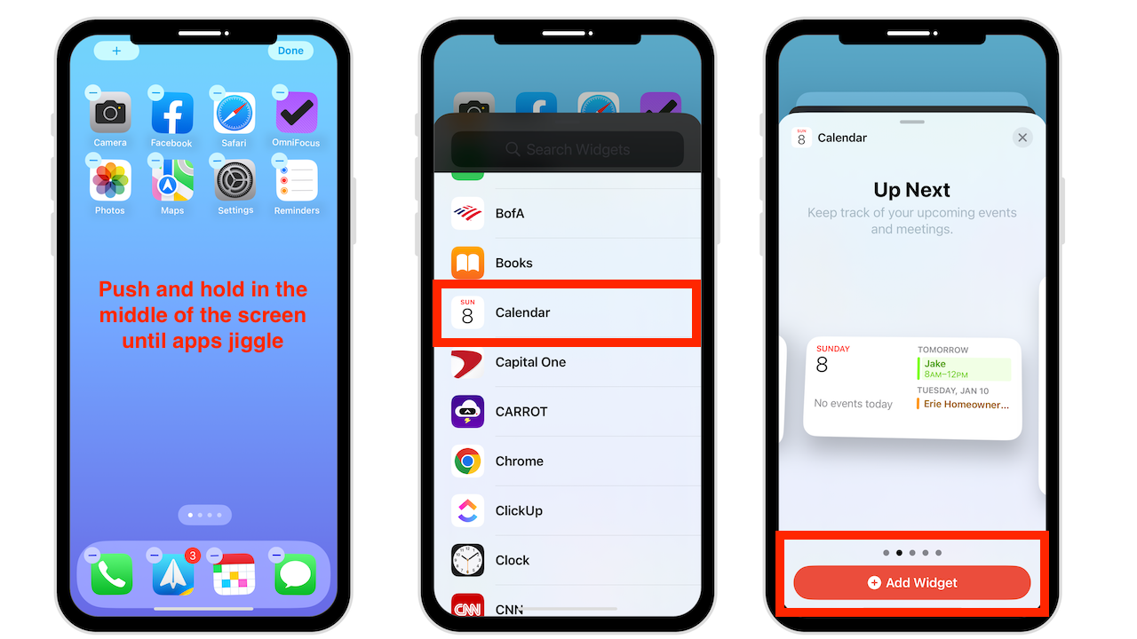 Presiona y mantén presionada la pantalla de inicio hasta que las aplicaciones se muevan. Toque el signo más y desplácese para elegir un widget. Elija el tamaño del widget y toque Agregar widget.
