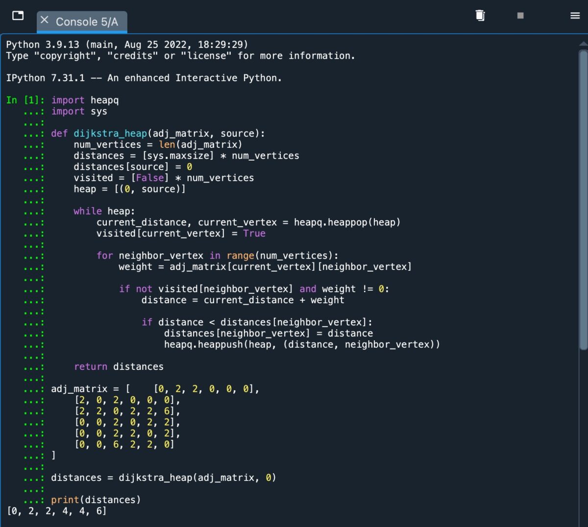 Como podemos ver en la captura de pantalla, recibimos una salida de [0, 2, 2, 4, 4, 6], que representa la distancia de ruta más corta desde el nodo de origen A hasta los nodos B, C, D, E y F.