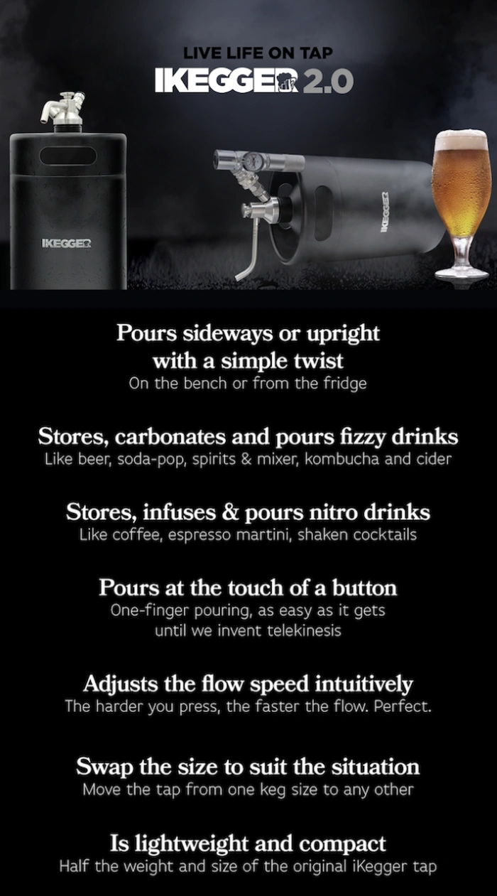 “Con el iKegger 2.0, hemos llevado las cosas a un nivel completamente nuevo, ofreciendo una versatilidad como ningún otro sistema growler o mini keg. Puede verter cualquier bebida, usando CO2 o nitrógeno, del tamaño de barril que elija, que van desde 2 L a 10 L, mientras está en posición vertical en su mostrador o acostado en su refrigerador. Además, con nuestras opciones de barril isotérmico, sus bebidas se mantendrán frías todo el día (y estamos hablando de las temperaturas australianas aquí, nos gustan nuestras bebidas heladas y nuestro clima muy caliente)”.