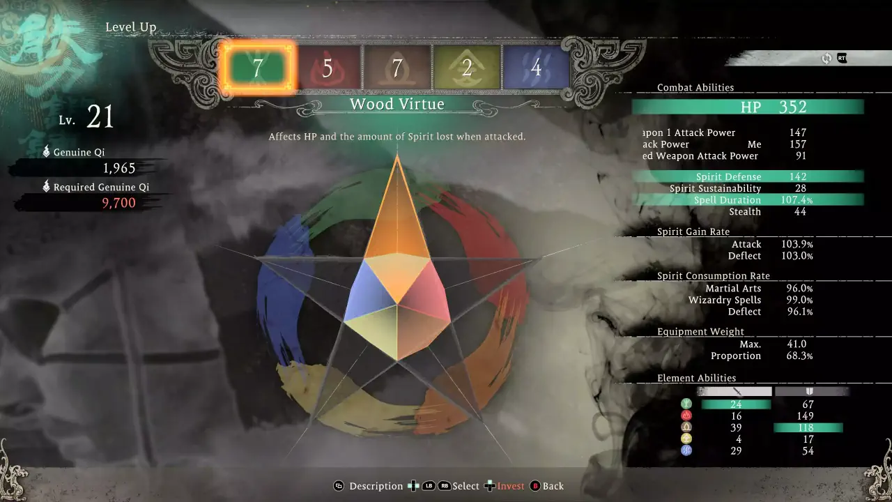 Aumento de HP. Aumenta la defensa espiritual. La duración del Hechizo aumenta. Aumento de la afinidad por la madera. La resistencia de tierra aumenta mientras que la resistencia del metal disminuye.